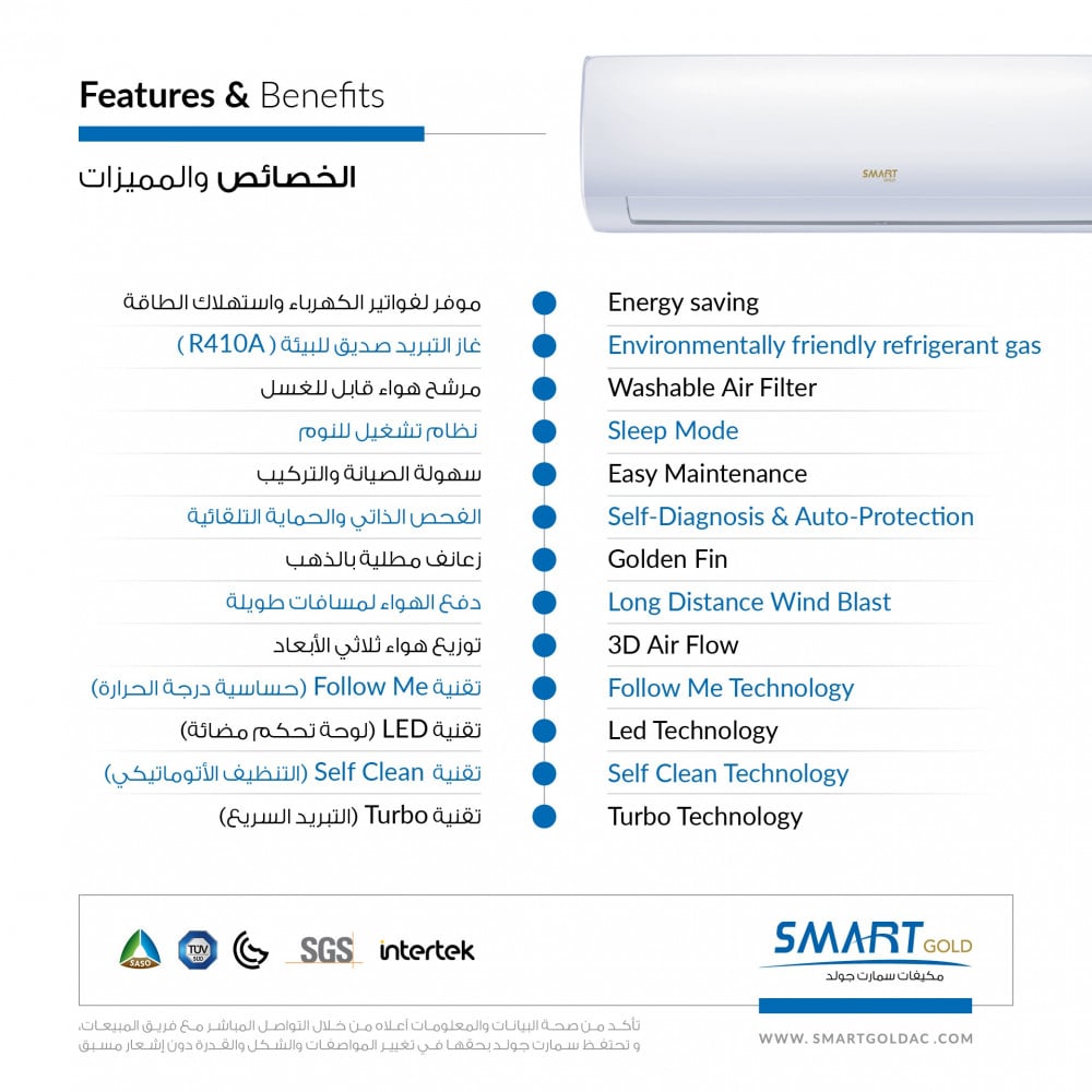 - غاز التبريد صديق للبيئة ( R410A ) .